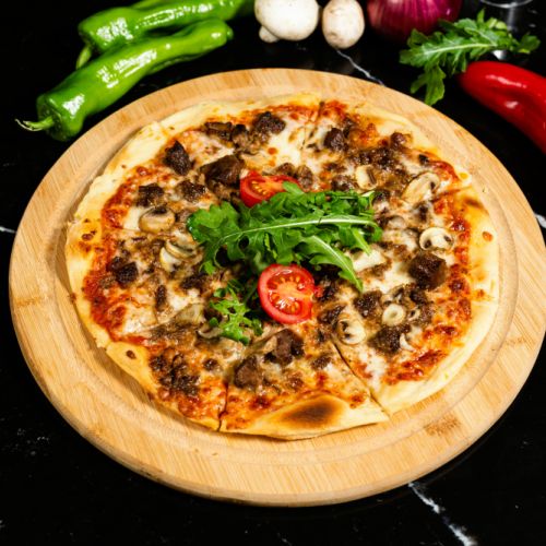 Dana kavurma, mozzarella peyniri, mantar, mısır, roka (isteğe bağlı soğan) servis edilir.