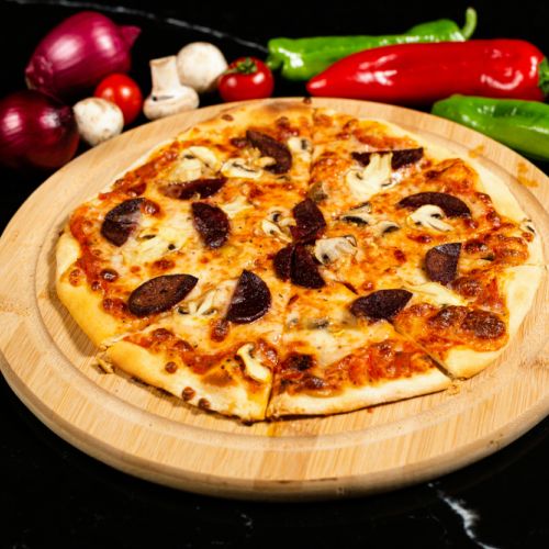 Mozzarella peyniri, mantar, sucuk ile servis edilir.