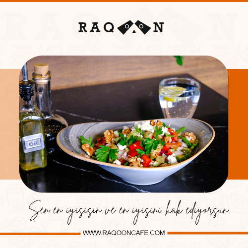 Tulum peyniri, domates, salatalık, renkli biberler, soğan, maydanoz, ceviz ve raqoon özel sosu ile servis edilir.